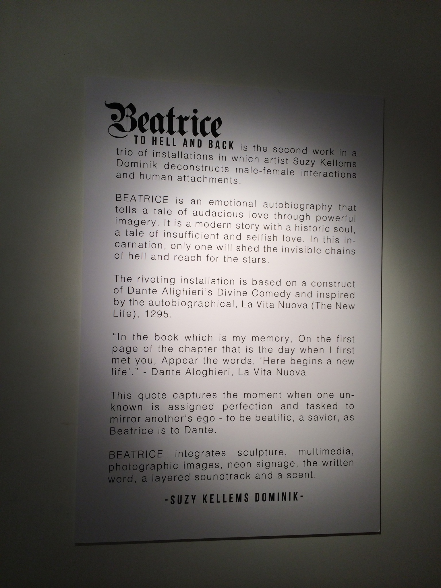 Coincidental find.. Saw my name written in big letters on the glass window of the Onishi Gallery ( although it was more the American Beatrice name, mine derives from Portugal, Beatriz) and I immediately had to investigate what this exhibit was about. Suzy Kellems Dominik is the artist. She was inspired by Italian writer Dante and his Book Divide Comedy ( which I own ) where Dante travels through hell in search for his beloved Beatrice. Enjoy these pics all taken by me.