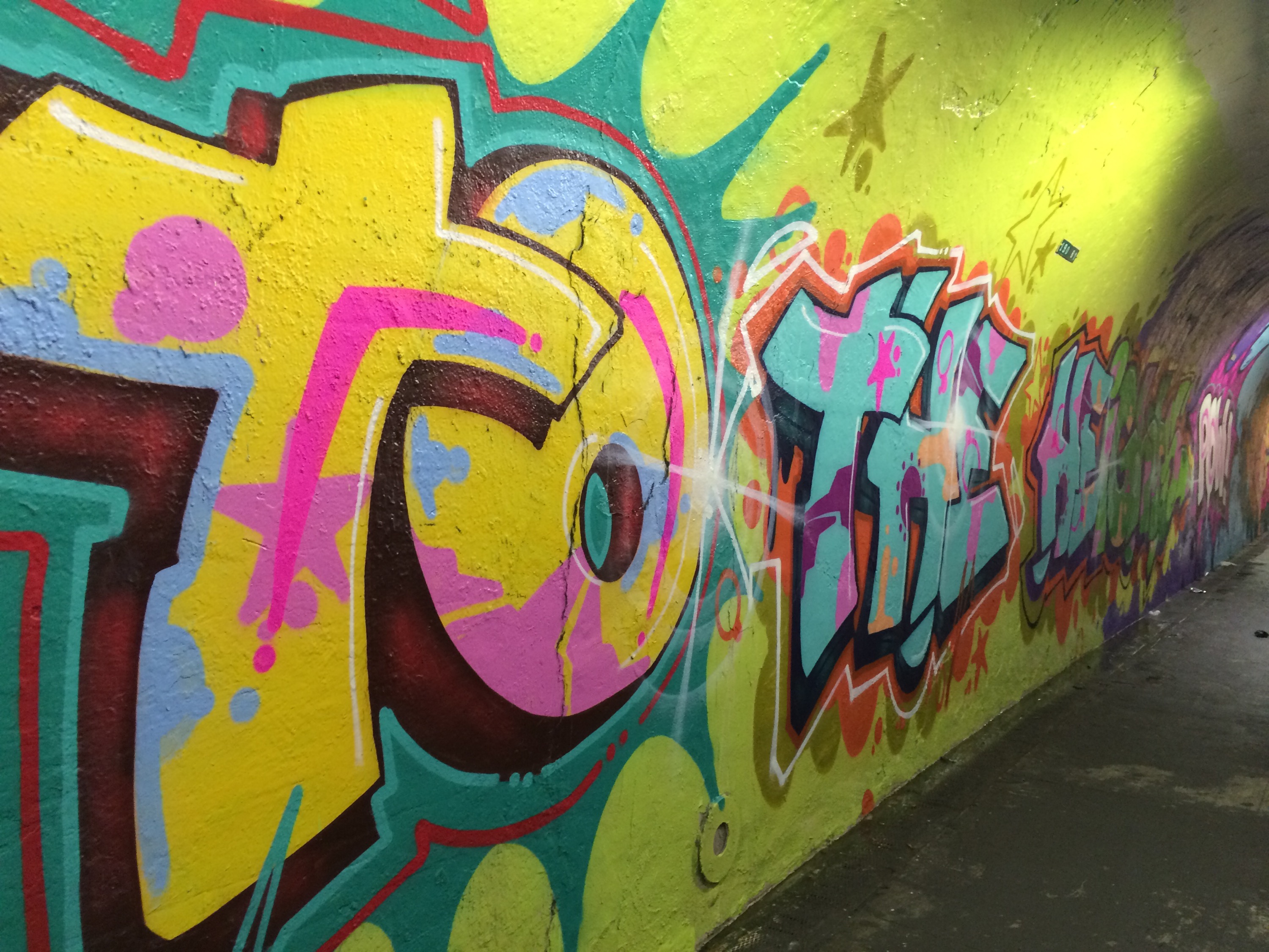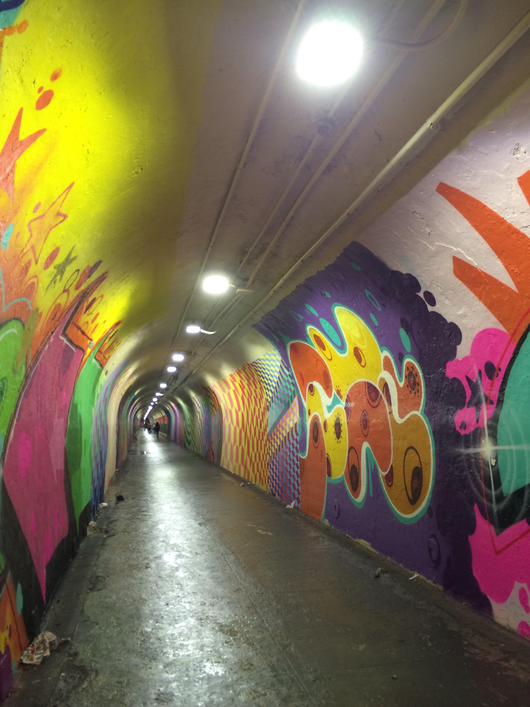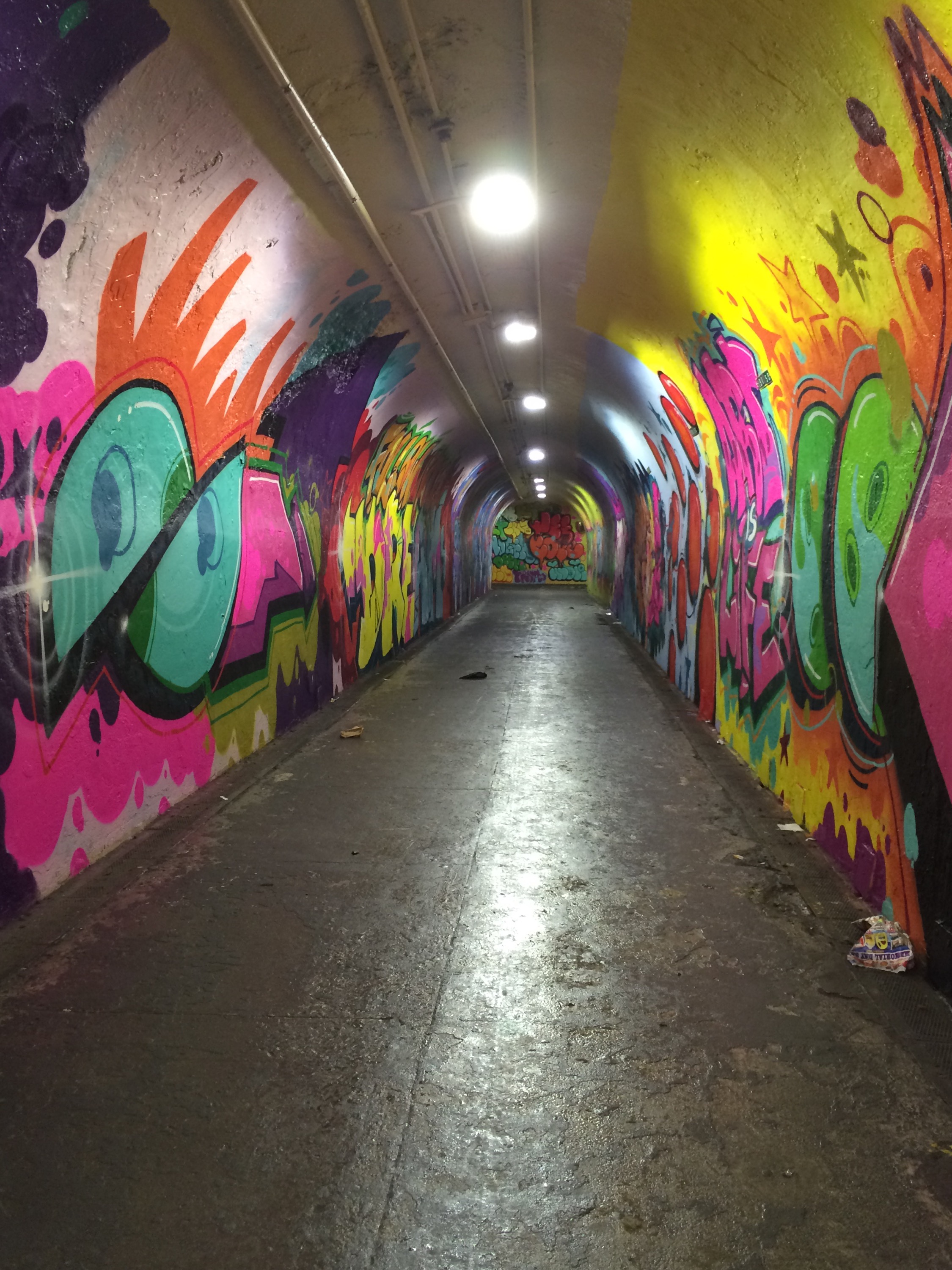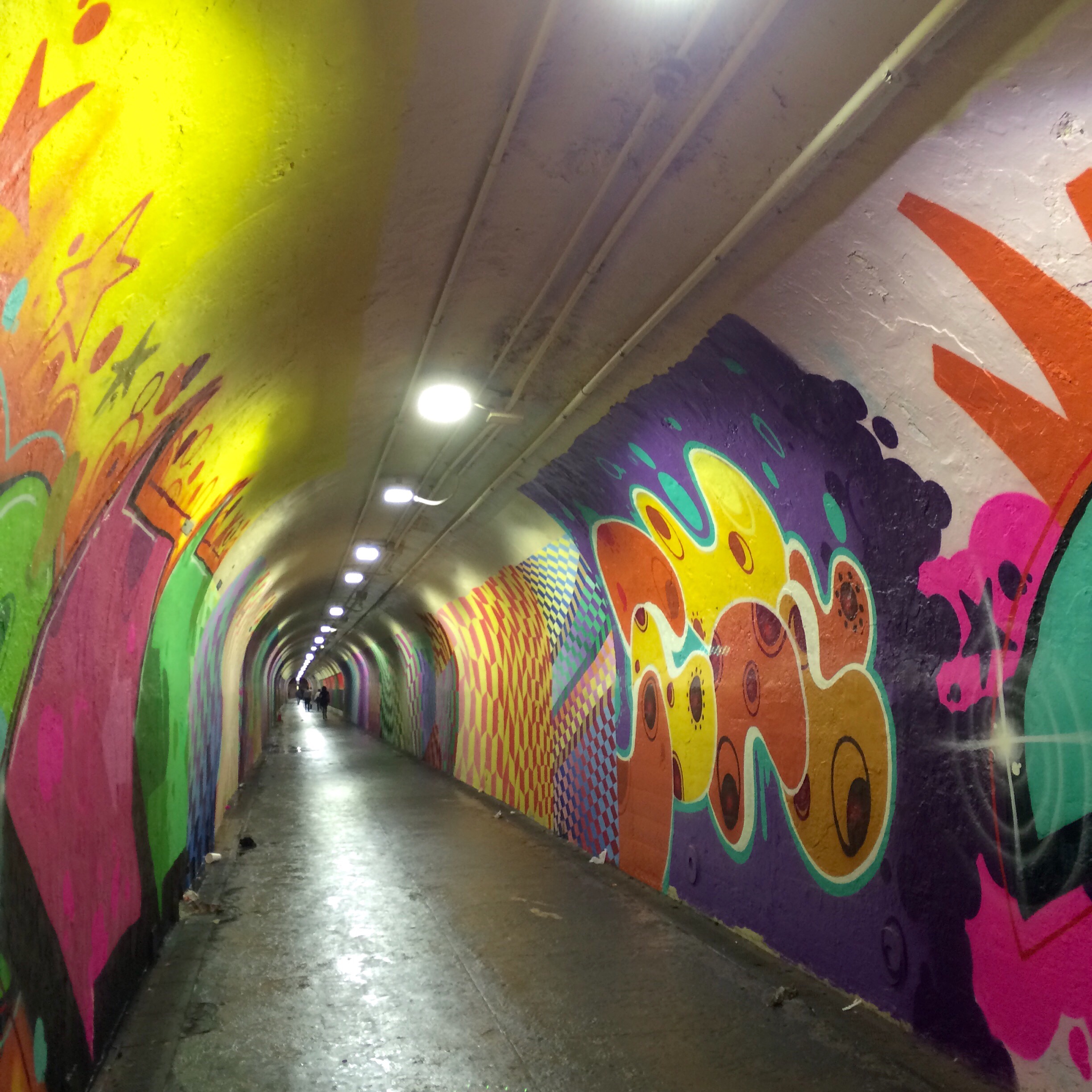 my neighborhood.. Mostly populated by Doninicans… Has this super long tunnel connecting Broadway to The train station .. 191st on the 1 Train. It was a plain tunnel filled with garbage, leaking water and tasteless graffiti.until this month.. May 2015, when a flew talented artists got together and made my internal thoughts come to life : they pimped the Tunnel into this marvelous passage way filled with wonderful art. One of the artists is my dear high school friend Gusto (www.gustonyc.com) who happens to be an creative Director and runs gusto.nyc. Here are some of my iPhone snaps :